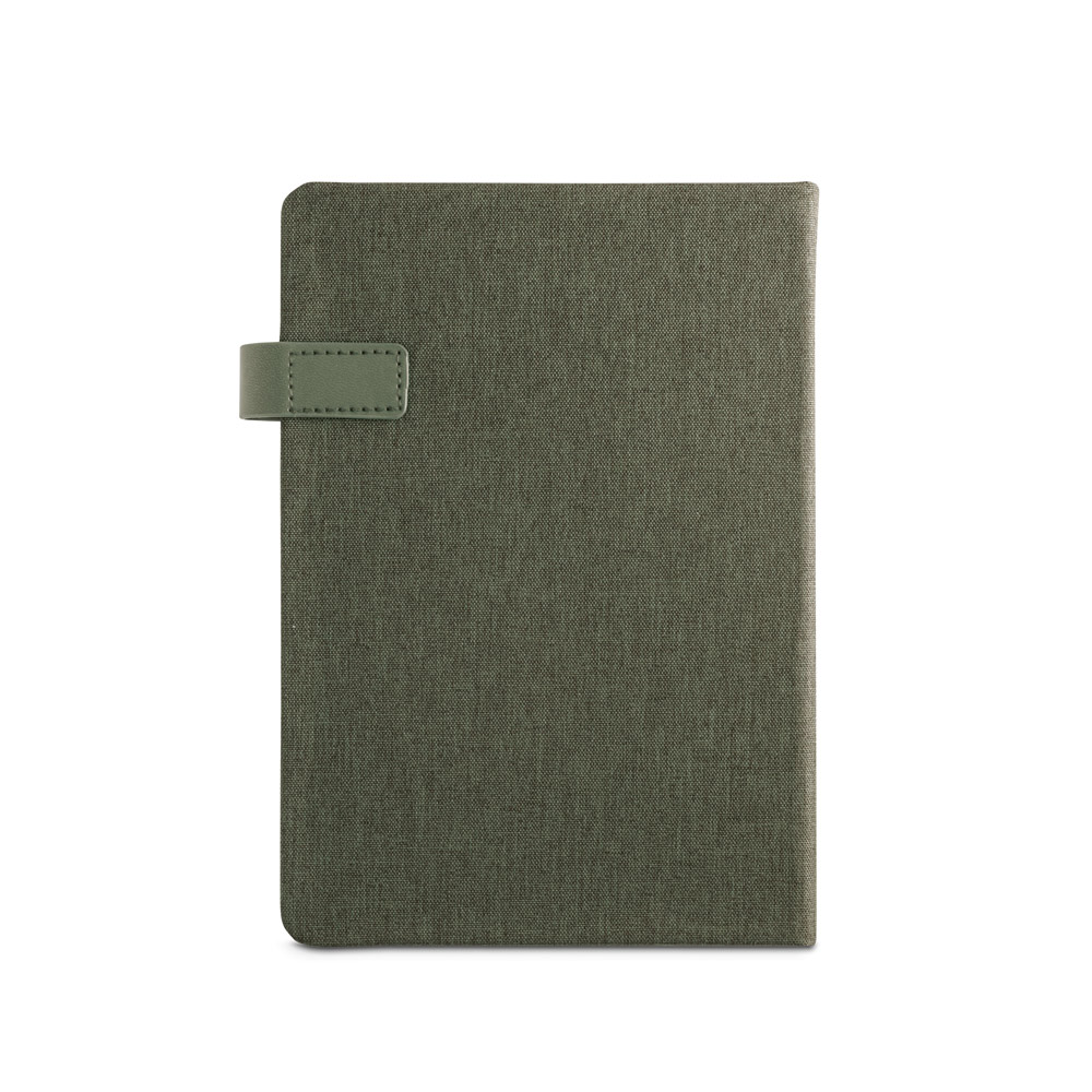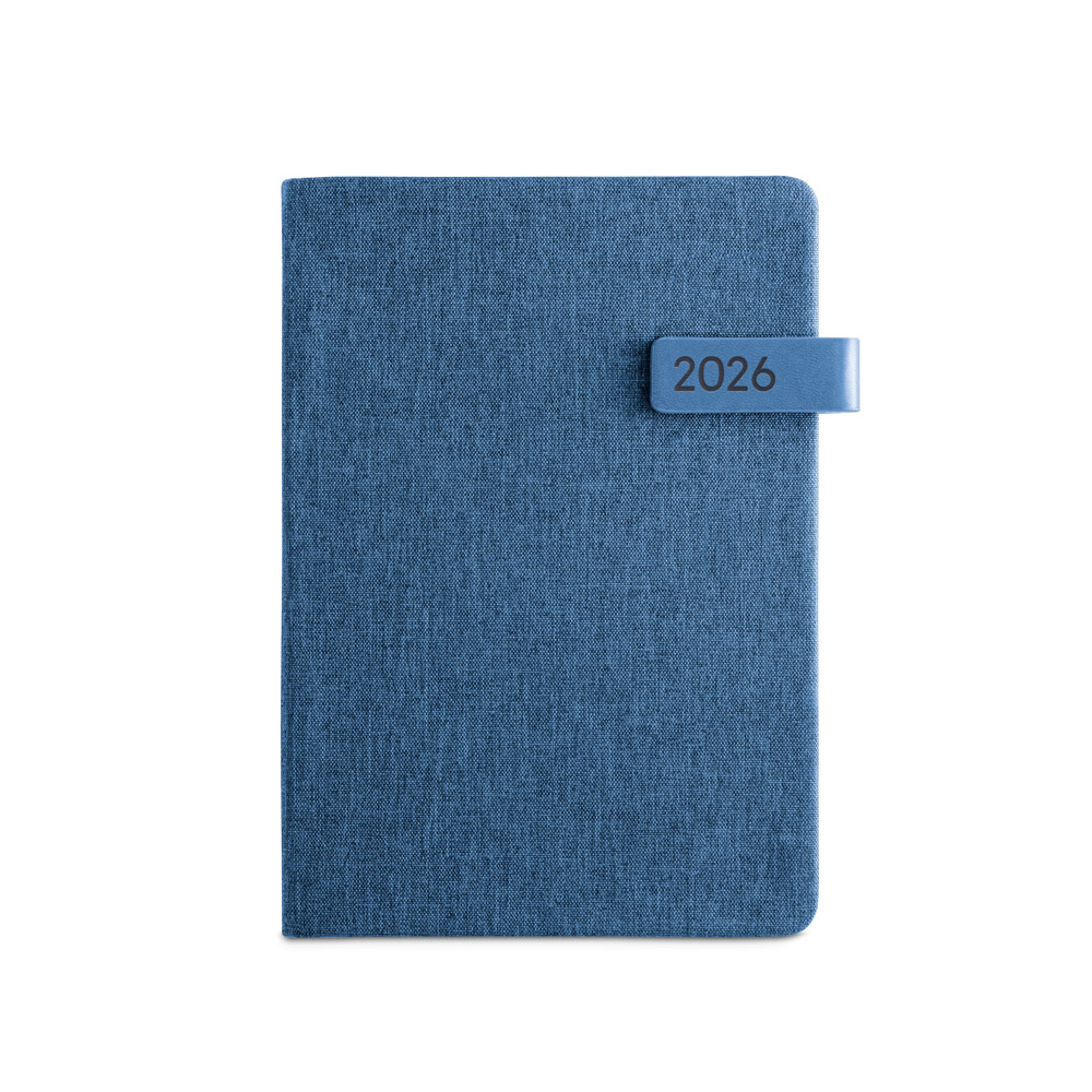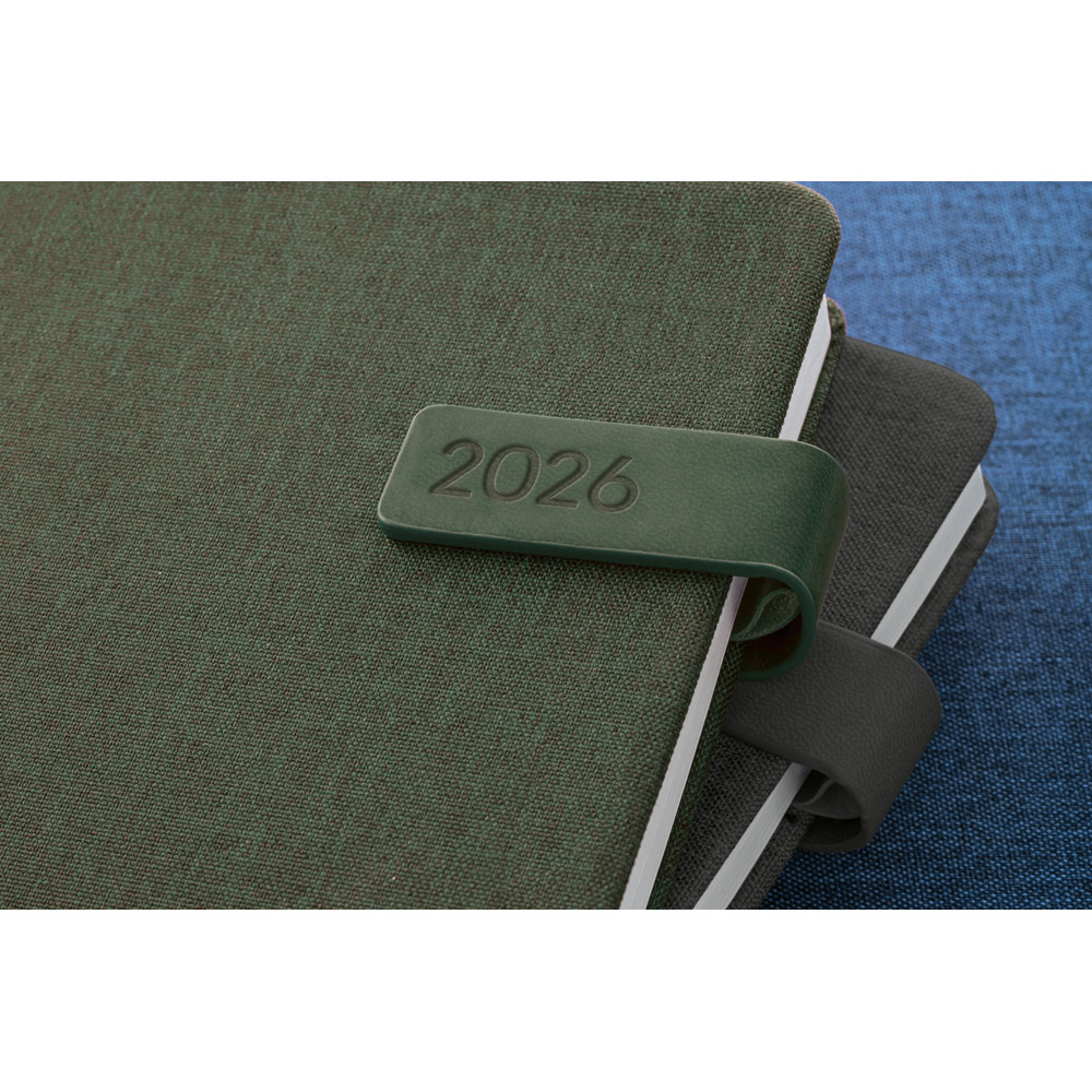 Agenda personalizada anual em PET reciclado (100% rPET), com fecho magnético em PU. Possui um marcador em fita e suporte para esferográfica (não inclusa). Está organizada num plano diário. Fornecida com bolsa de non-woven. 148 x 210 mm | Bolsa: 205 x 250 mm.