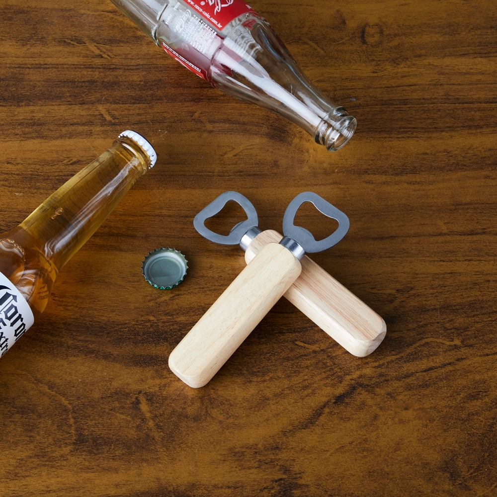 Abridor de garrafa personalizado metálico com cabo de madeira. Largura : 4 cm Espessura : 1,9 cm Comprimento : 13,9 cm