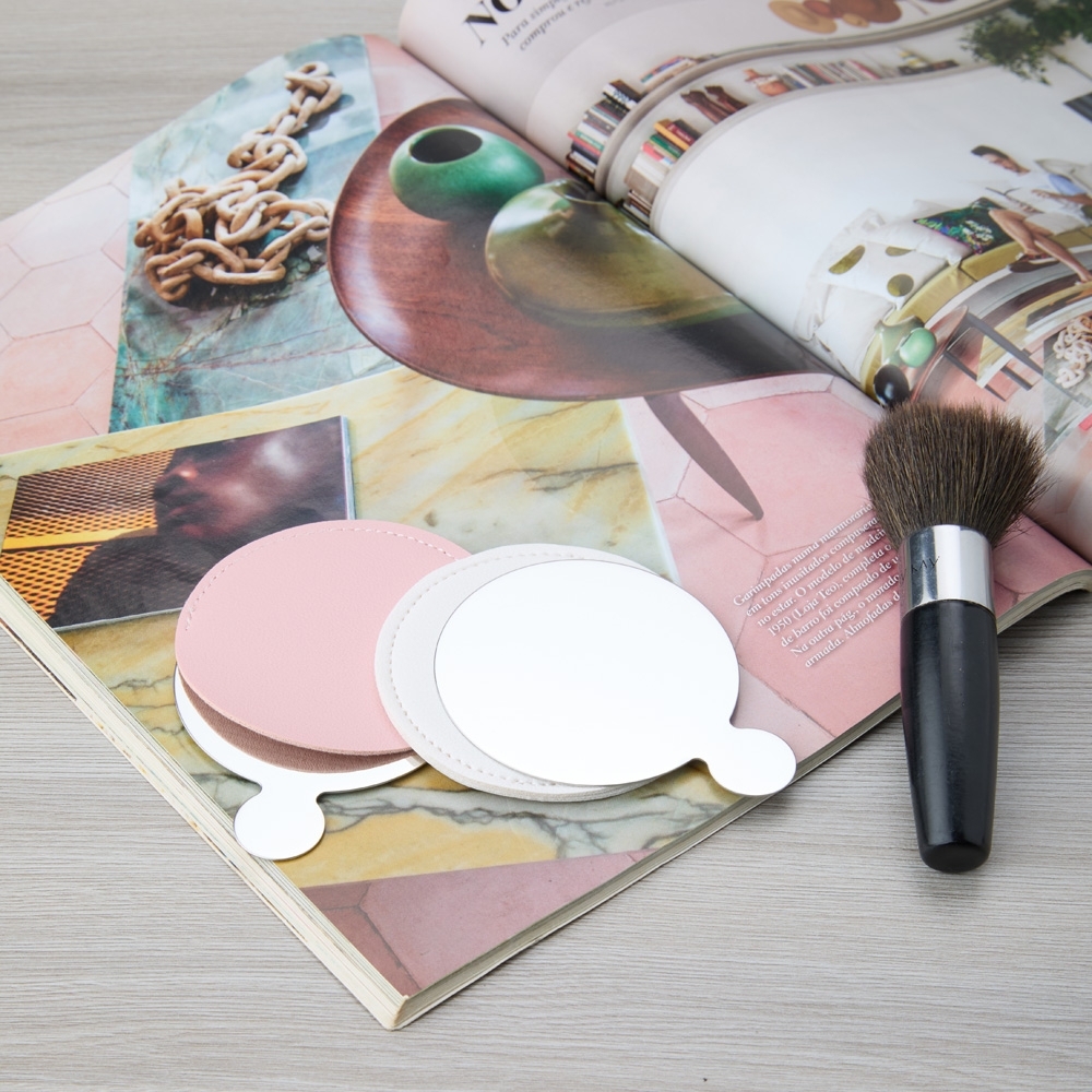 Espelho personalizado redondo, de aço inoxidável inquebrável com design ultrafino, resistência e durabilidade inigualáveis. Com acabamento polido altamente reflexivo e verso escovado, o espelho é acompanhado por uma capa em couro sintético para proteção e um toque de sofisticação ao produto. Altura : 8,5 cm Largura : 6,6 cm Espessura : 0,1 cm