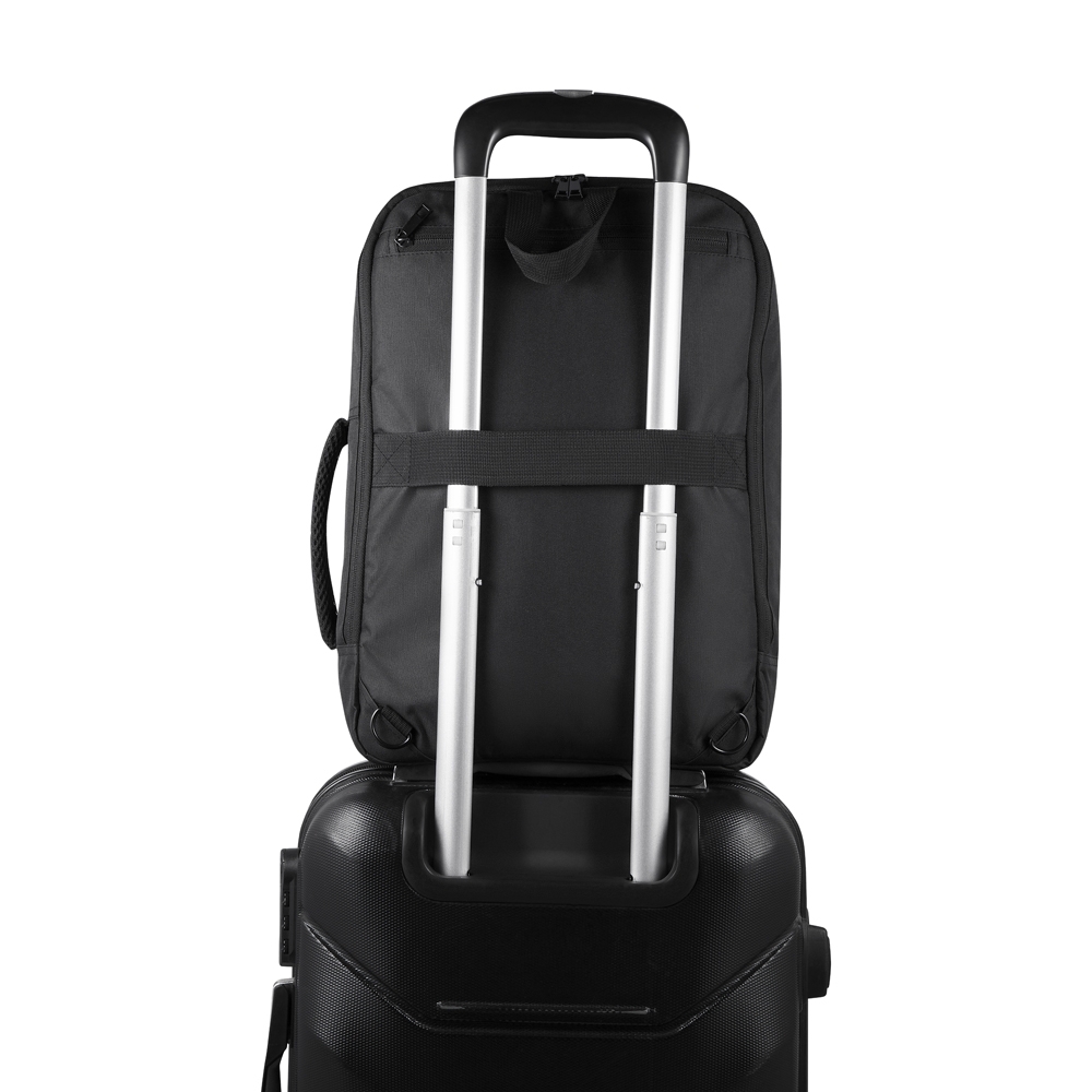 A Mochila Pasta Personalizada Poliéster 20L é confeccionada em poliéster 300D impermeável com detalhes em couro sintético, fechamento em zíper e capacidade de 20 litros.