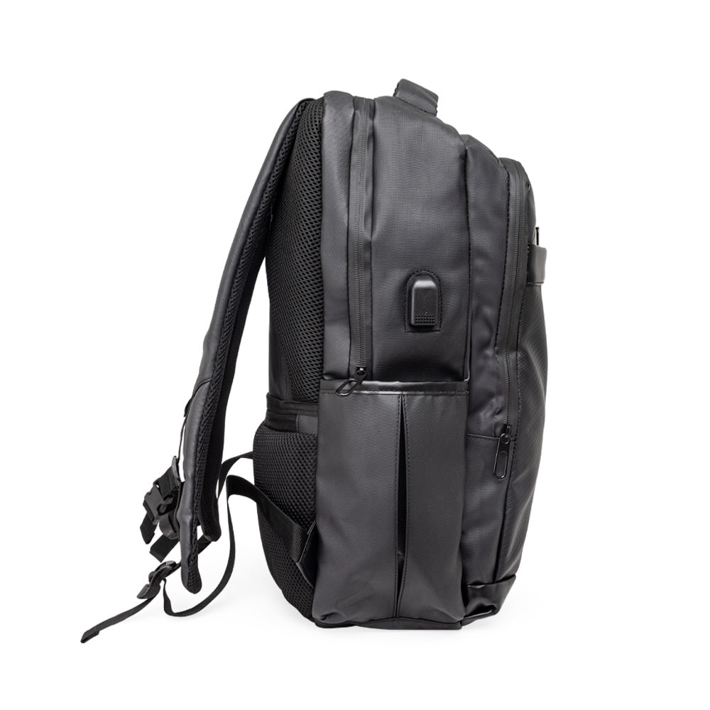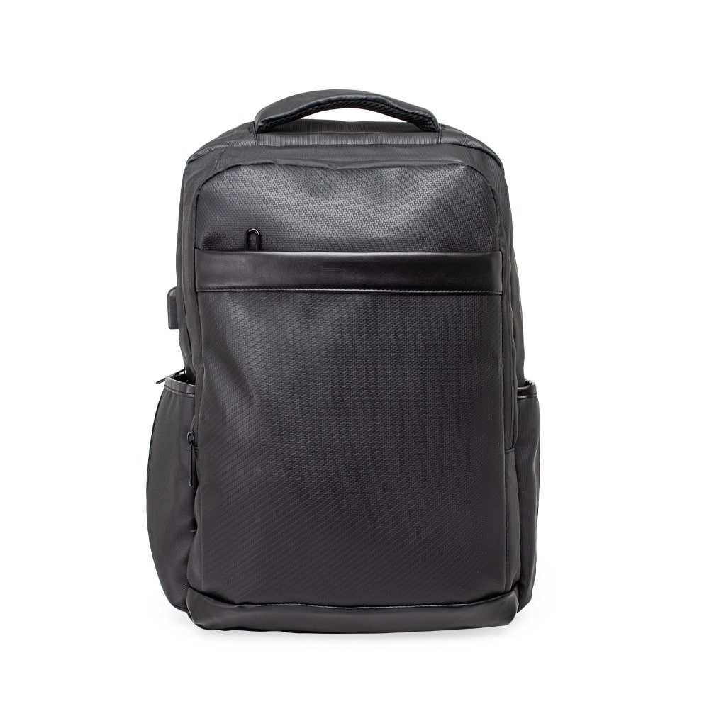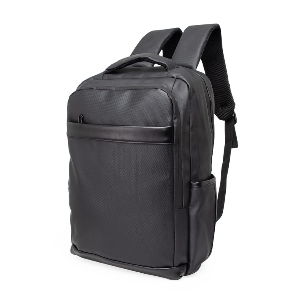 Mochila Personalizada Couro Sintético 36 Litros. Nossa mochila de 36 litros combina funcionalidade e conforto! Feita em couro sintético resistente à água e com design inteligente, é perfeita para impressionar no mundo corporativo. Conta com quatro compartimentos estratégicos: um frontal, outro com bolsos e divisórias para documentos e canetas, um compartimento antifurto para proteger os itens mais valiosos e um principal, com espaço para notebooks de até 15,6″ e entrada para cabo USB. Além disso, possui dois bolsos laterais, alças reguláveis e acolchoadas que distribuem o peso de forma equilibrada, acabamentos refletivos e uma parte traseira acolchoada, garantindo mais conforto. Para completar, conta com engate para malas de viagem, sendo a parceira ideal além do dia a dia do trabalho. Altura : 46 cm Largura : 29 cm Profundidade : 13 cm