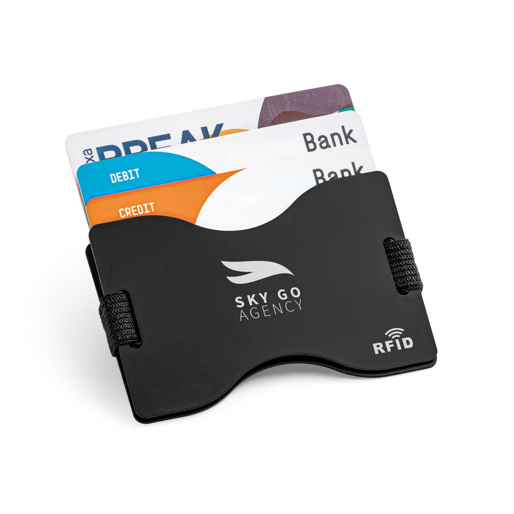 Porta Cartão Personalizado, em alumínio com bloqueio de RFID e fita elástica em poliéster. O porta cartões tem acabamento mate e capacidade para 12 cartões. Seu formato compacto e funcionalidade de bloqueio RFID permitem que seja guardado de forma cómoda e segura em bolsos. 90 x 58 mm