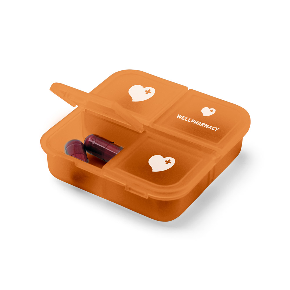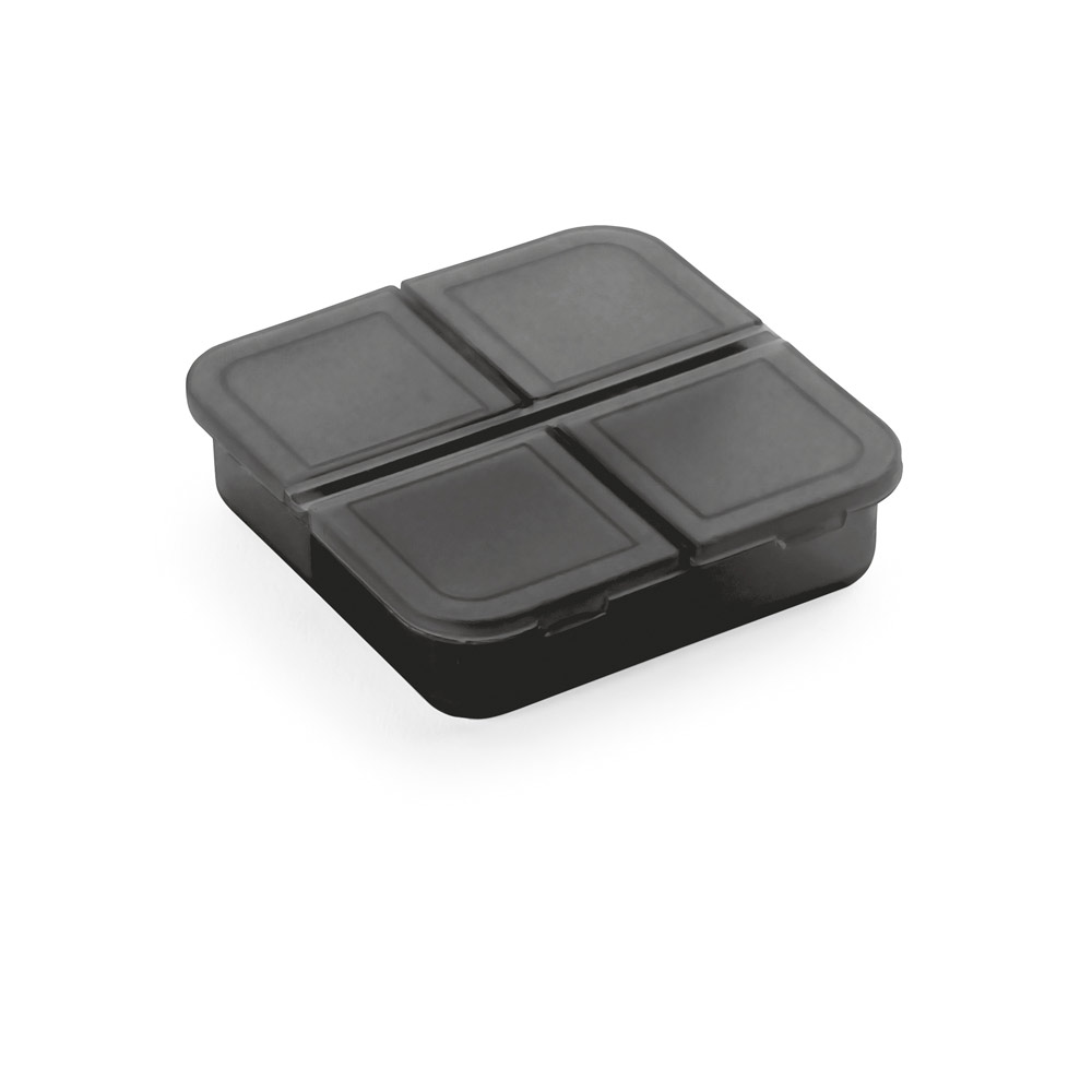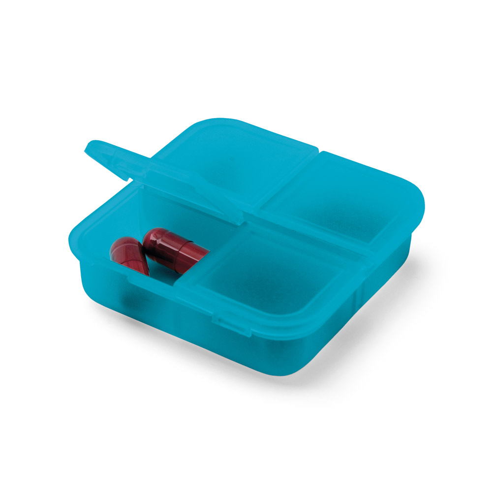 Porta comprimidos personalizado com 4 divisórias com tampa, disponível em várias cores. Certificação EU Food Grade. 60×60 x18 mm
