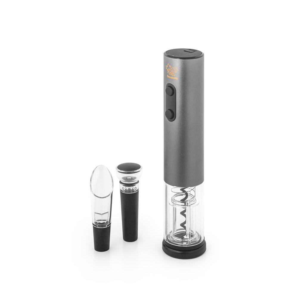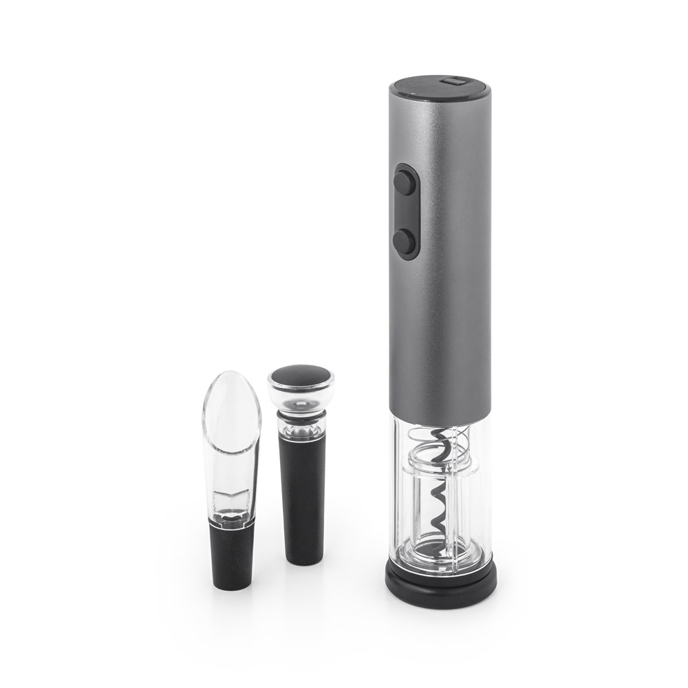 Conjunto de saca rolhas personalizado elétrico + acessórios, em alumínio: corta-cápsulas, rolha de vácuo e salva-gotas (pilhas inclusas). Fornecido em caixa presente. Saca-rolhas: 45 x 225 mm | Caixa: 241 x 90 x 54 mm