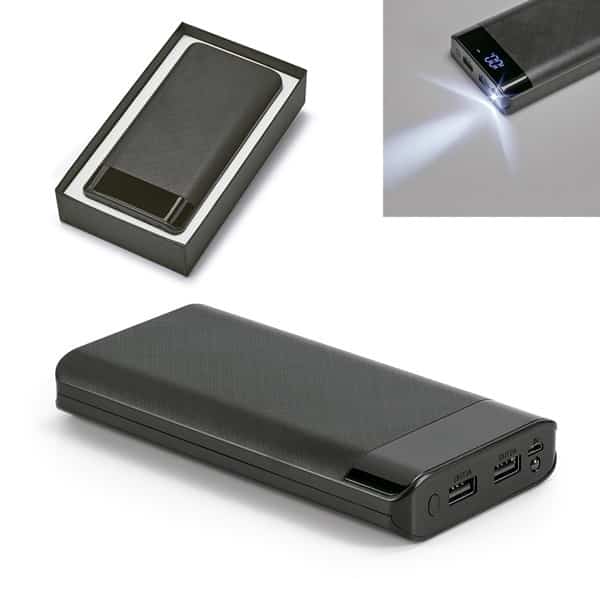 Bateria Portátil Personalizado. ABS. Com LED. Bateria de lítio. Capacidade: 16.000 mAh. Tempo de vida ≥ 1.000 ciclos. Com entrada 5V/2.1A, saída 5V/1-2.1A, indicador de carga, 2 portas USB e 1 porta micro USB. Com proteção para sobrecarga, curto circuito e sobreaquecimento. Incluso cabo USB/micro USB para carregar a bateria. Fornecida em caixa presente. 156 x 80 x 23 mm | Caixa: 175 x 100 x 30 mm