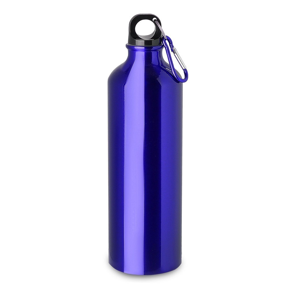 Garrafa personalizada em alumínio, tampa de plástico com mosquetão colorido. Capacidade de 750ml, com pintura metálica.