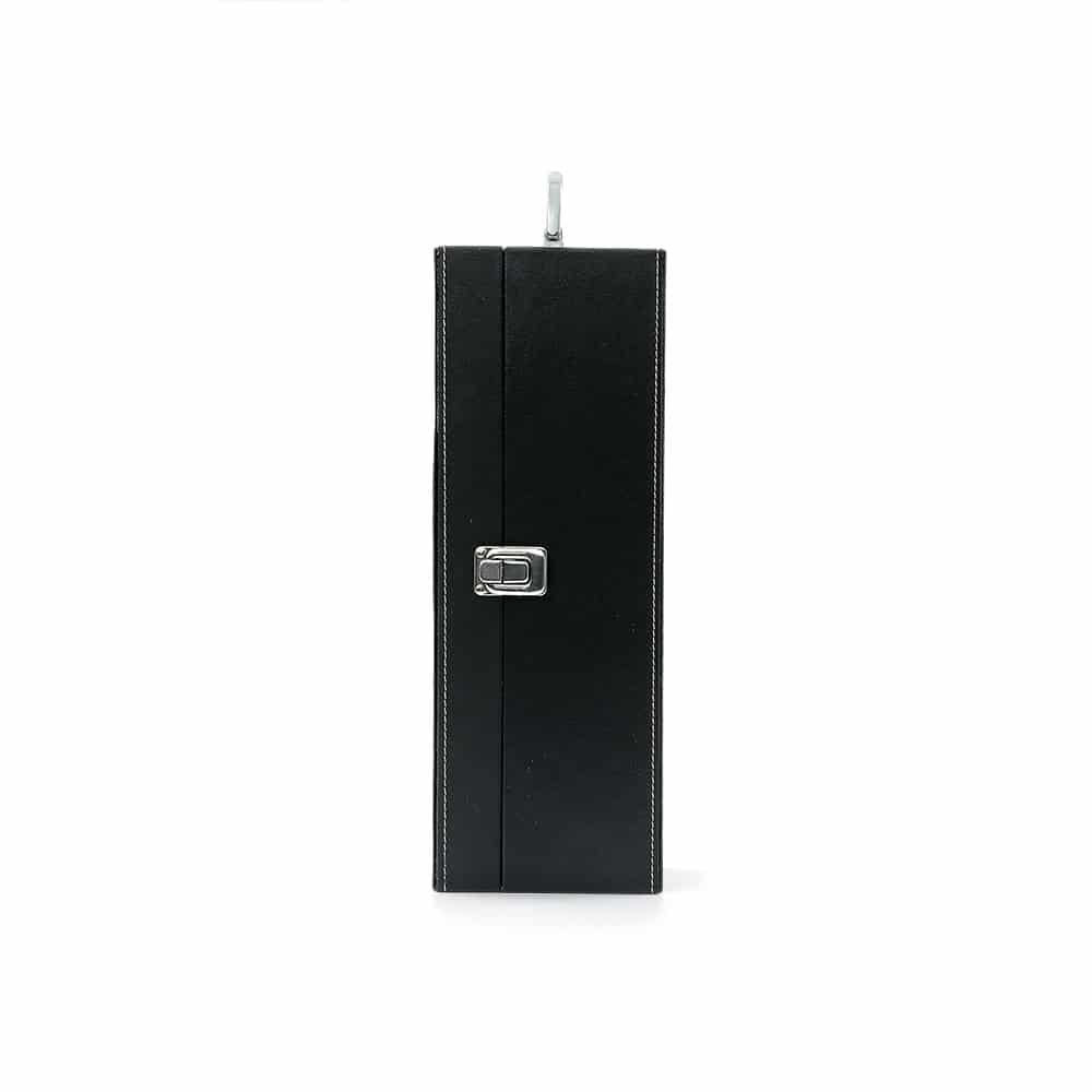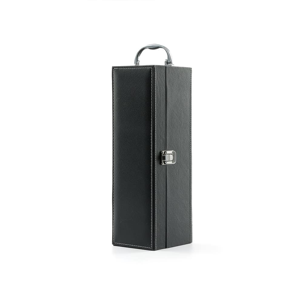 Kit vinho personalizado 4 peças em maleta de couro sintético. Contém saca-rolhas metálico, bico condutor com tampa, cortador de lacre e wine colar. Maleta com alça, trava de segurança e parte interna revestida de veludo com área de acomodação para garrafa.