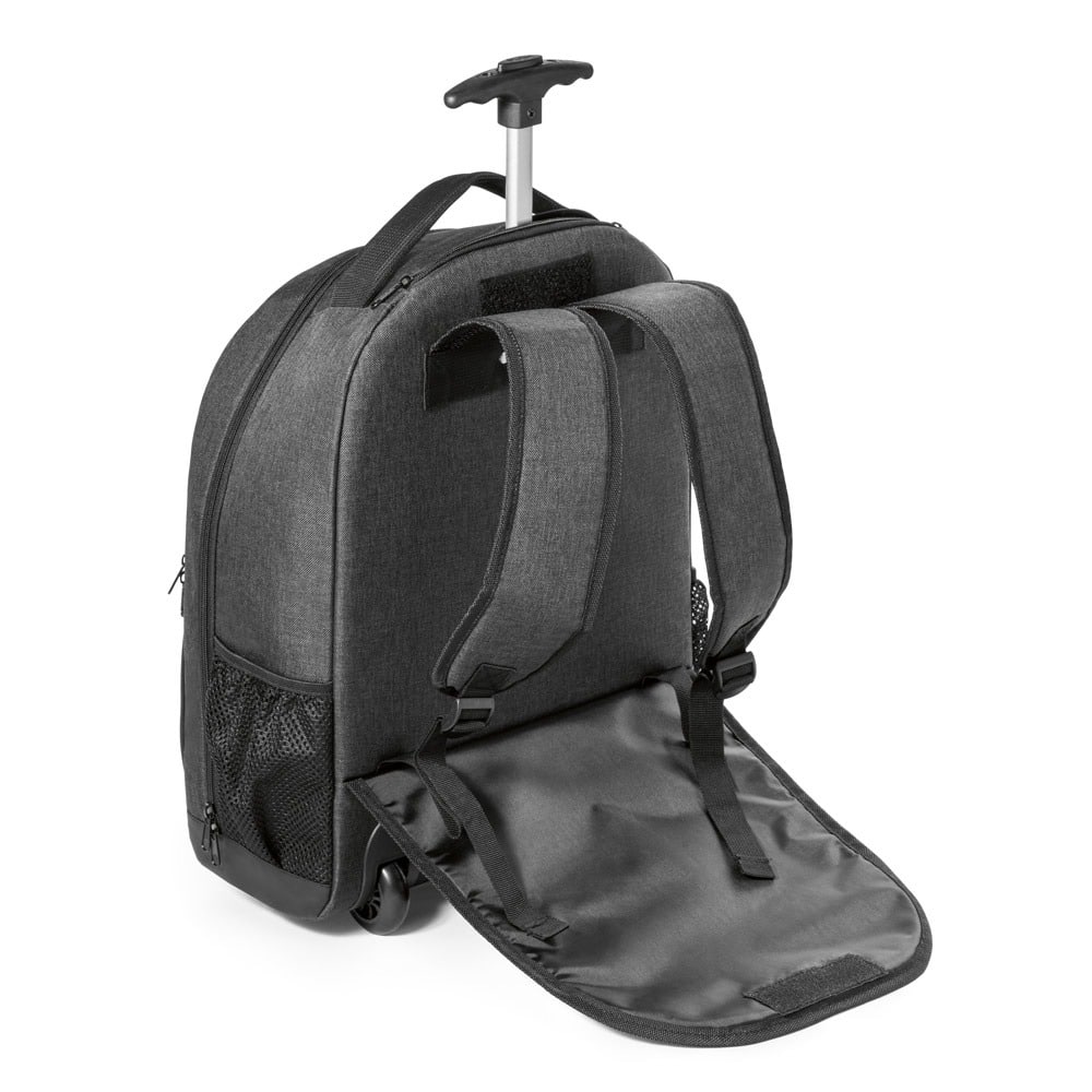 Mochila de Rodinha Personalizada Trolley para notebook em 600D de alta densidade e poliéster 600D impermeável. Compartimento principal para notebook até 15.6”. Bolso frontal com zíper e bolsos laterais com tela. Mochila de Rodinha Personalizada Trolley com protetor de rodas e pega extensível em metal. Parte posterior e alças almofadadas. Incluso placa metálica removível com imã, para fácil gravação. 340 x 430 x 170 mm