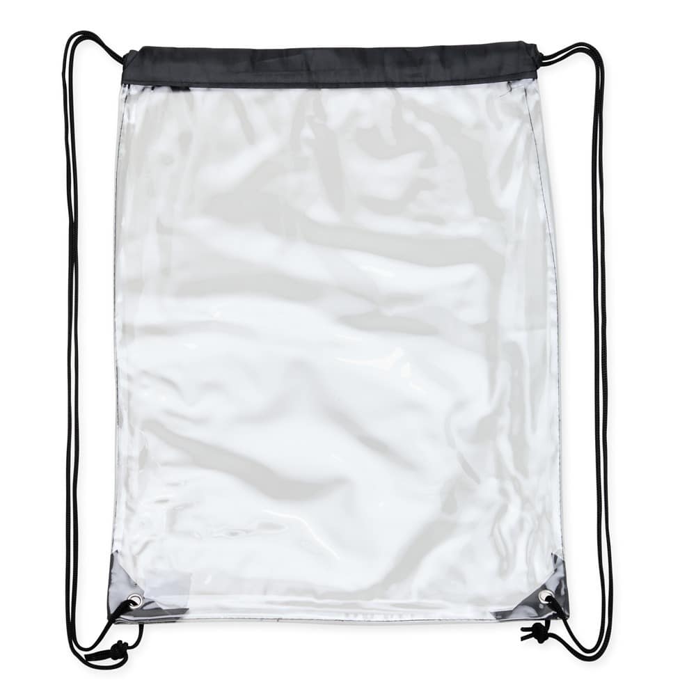 Mochila Saco personalizada em PVC transparente com detalhes em tecido nylon, alças reguláveis e dois ilhós metálicos.