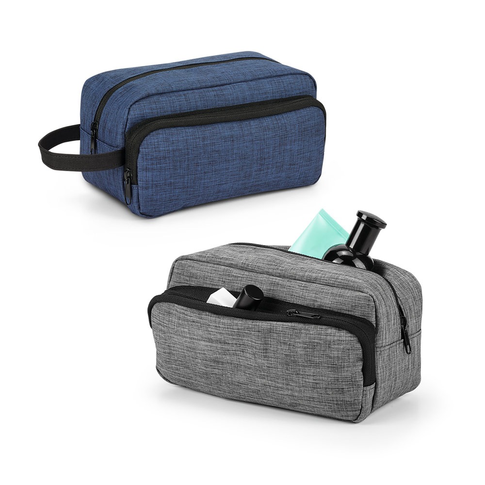 Nécessaire. 300D de alta densidade. Com pega e bolso frontal. Interior forrado. 220 x 115 x 115 mm.