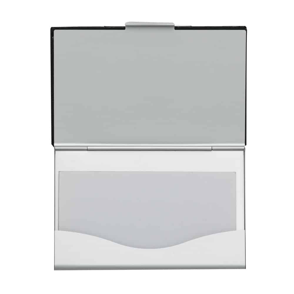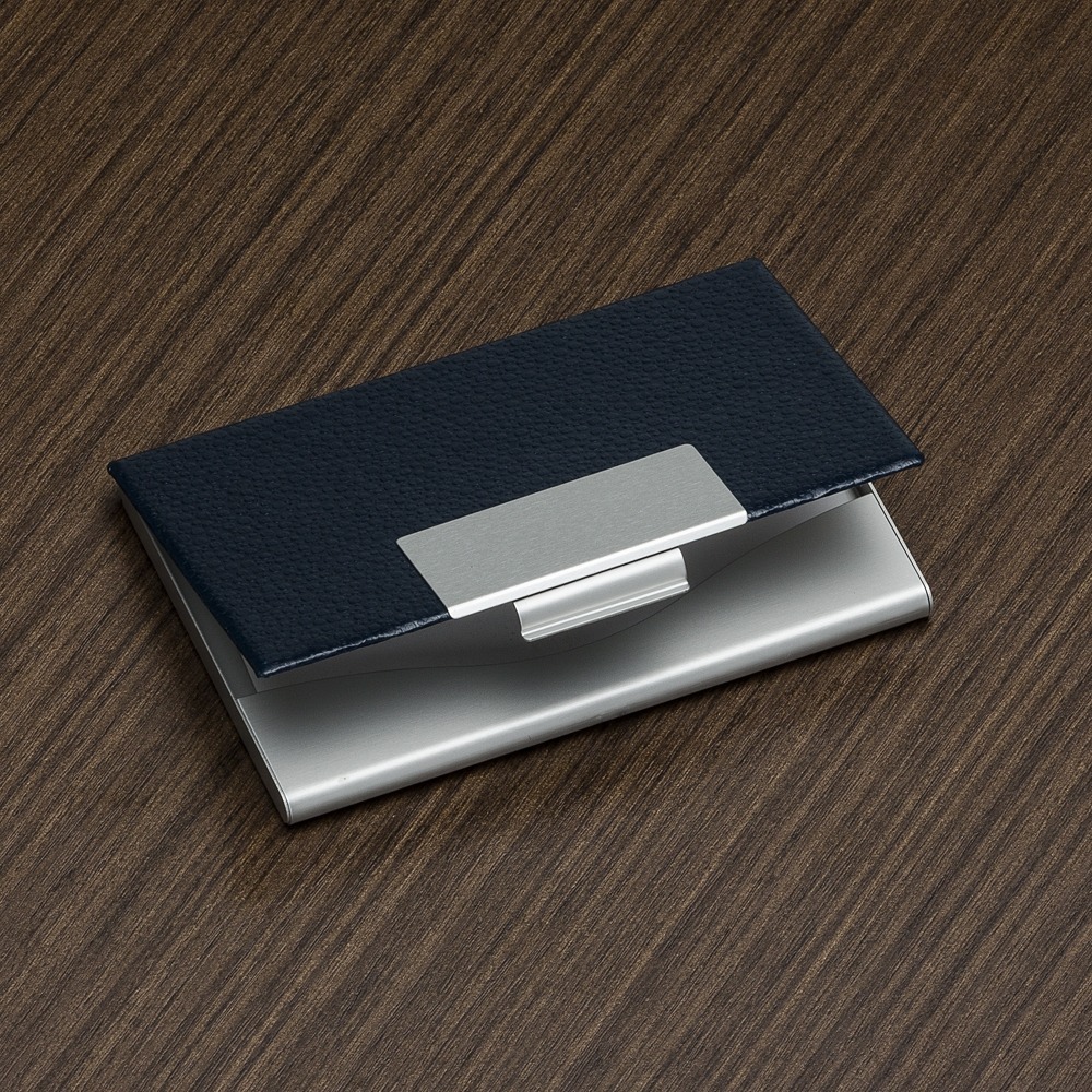 Porta Cartão Personalizado em couro sintético com detalhes em prata. Possui chapa central em metal para gravação, parte interna e traseira em alumínio.