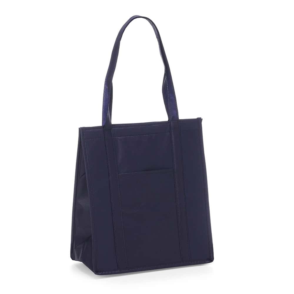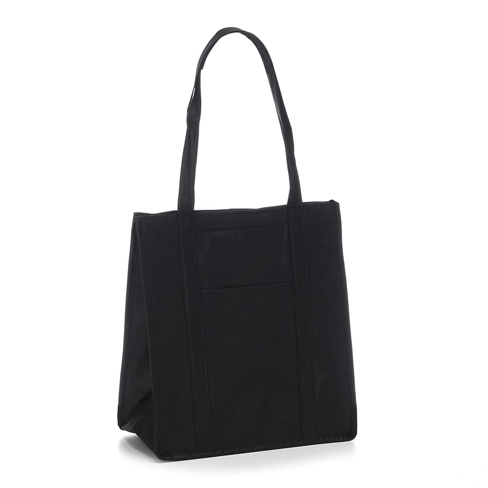 Sacola Personalizada TNT térmica com capacidade de 18 litros, contém fechamento em velcro e bolso frontal. Obs.: A capacidade de armazenamento com a Sacola Personalizada fechada é de aproximadamente 14 litros.